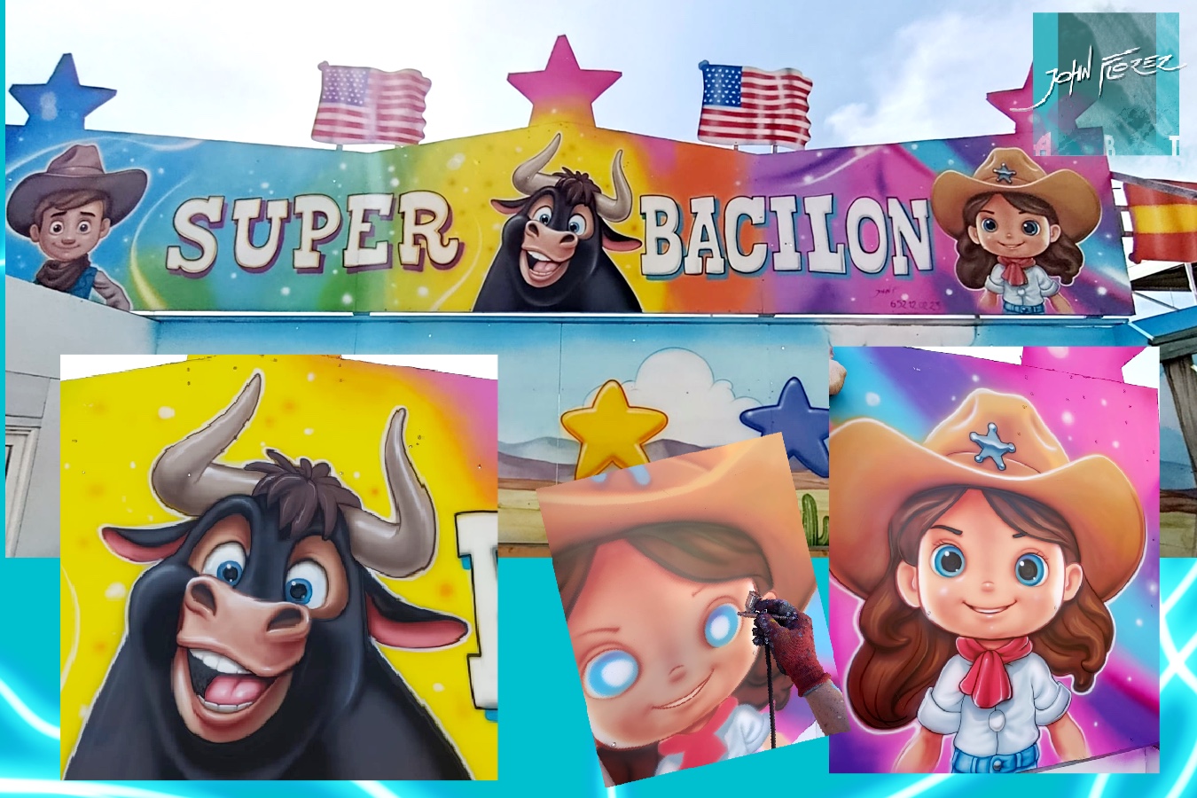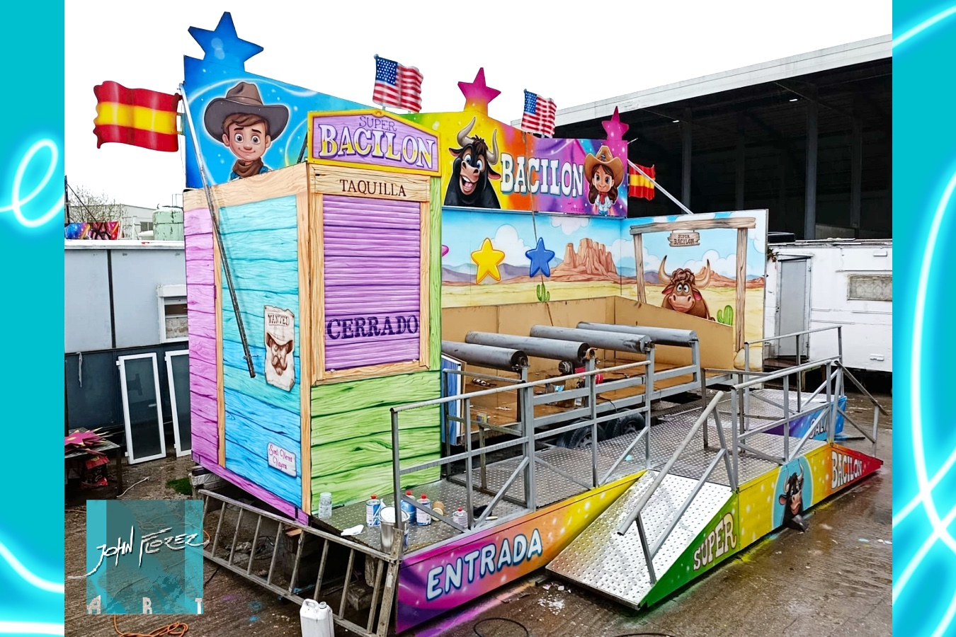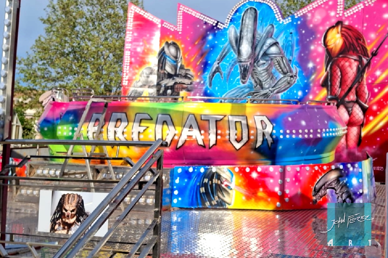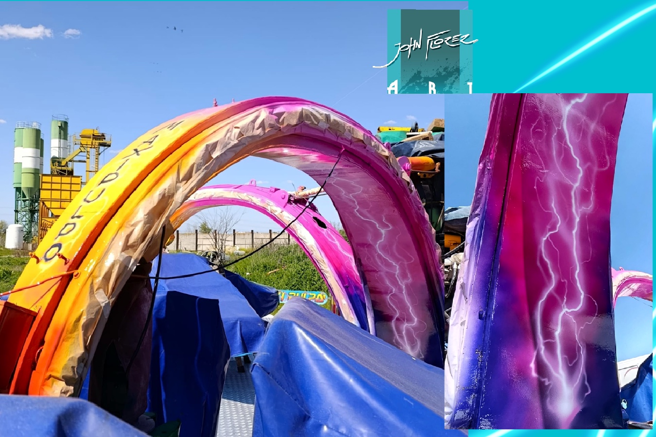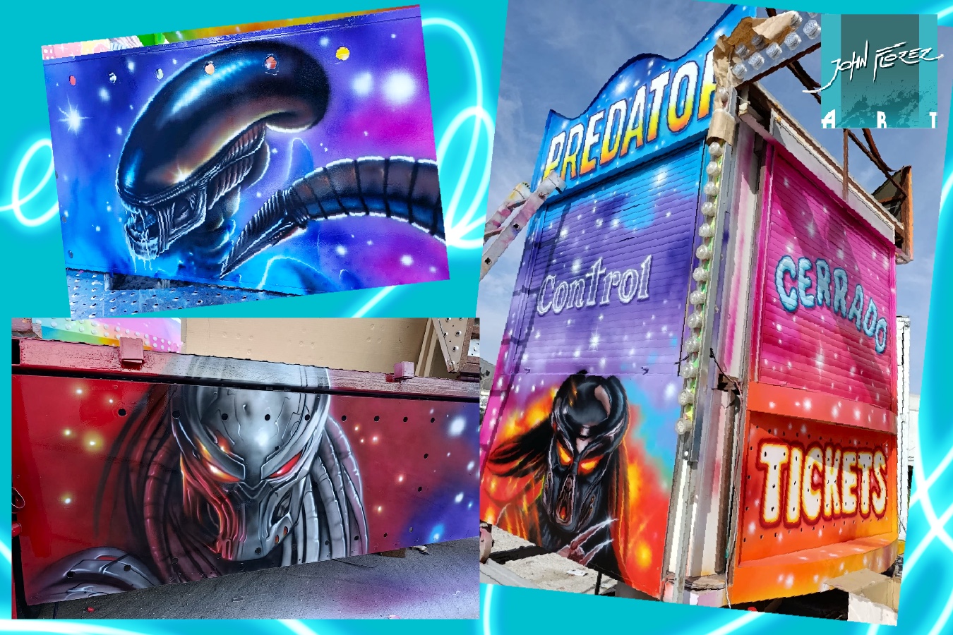 Las ferias y parques temáticos son los espacios mas adecuados para que la aerografía forme parte del proceso de creación ya que buena parte de los juegos, maquinas atracciones, murales y otros espacios son pintados y decorados con aerógrafo, además de aportar y unificar el diseño de estos. Murales de gran tamaño, decoración de juegos , muros de escalar, zonas temáticas. podemos encontrarlos en centros comerciales o al aire libre.